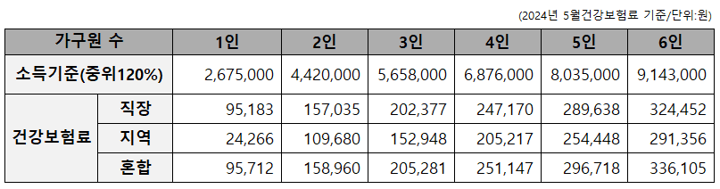 기준중위소득 120% 이하, 가구 규모별 건강보험료 소득산정 기준표