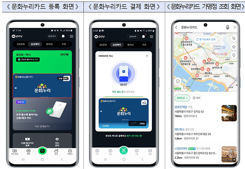 3월 25일부터 정부의 디지털서비스 개방으로 네이버페이앱에 문화누리카드를 등록하면 언제 어디서든 사용이 가능하며, 매번 누리집에서 가맹점을 찾아야 했던 반면에 이제는 네이버 지도앱을 켜고 문화누리카드로 검색하면 주변 가맹점 정보를 언제 어디서든 간편하게 검색할 수 있게 되었습니다.
