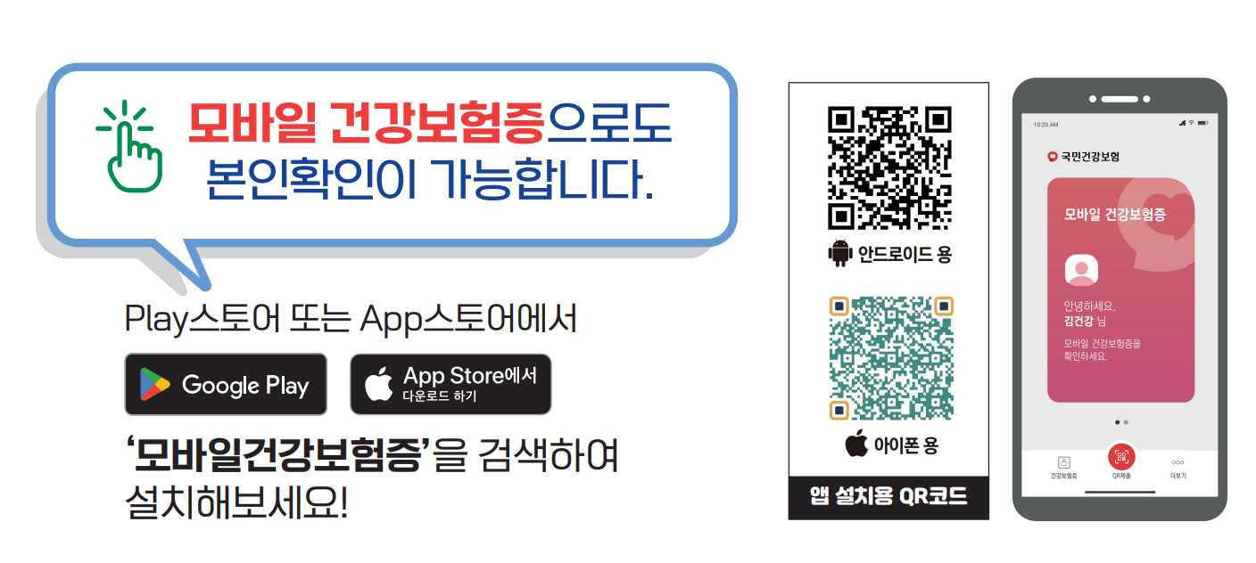 모바일 건강보험증(QR인증 포함), 모바일 신분증(운전면허증, 국가보훈등록증), 모바일 확인서비스(정부 24, PASS, KB스타뱅킹 앱)에 등록된 신분증 제시의 경우도 인정