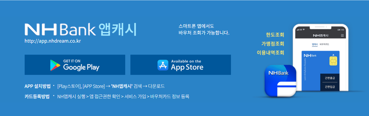 ▶ 카드등록방법 : NH앱캐시 실행 > 앱 접근권한 확인 > 서비스 가입 > 바우처카드 정보등록