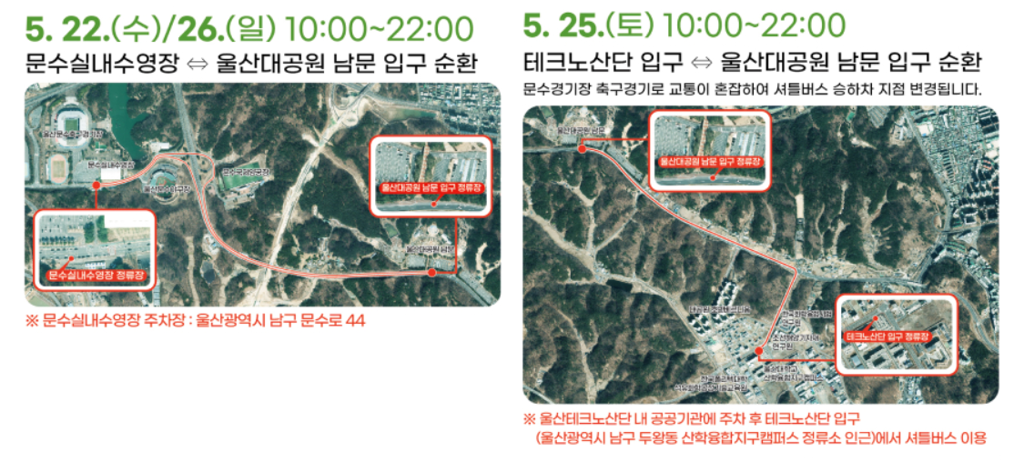 무료셔틀버스는 약 20분 간격으로 운행됩니다. (자가용 이용 시, 울산대공원 주차장은 유료)