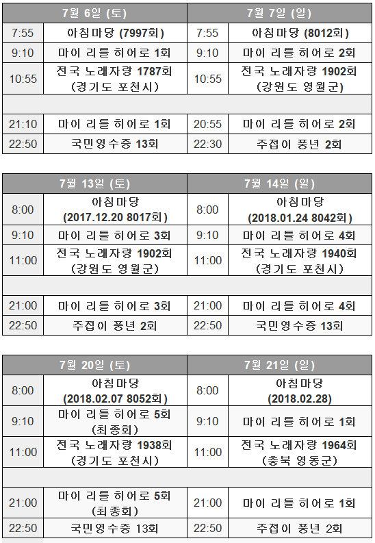 방송일정 : 7월 한달 동안 매주 주말 (토, 일요일) 오전 8시~12시까지, 오후 9시~12시까지