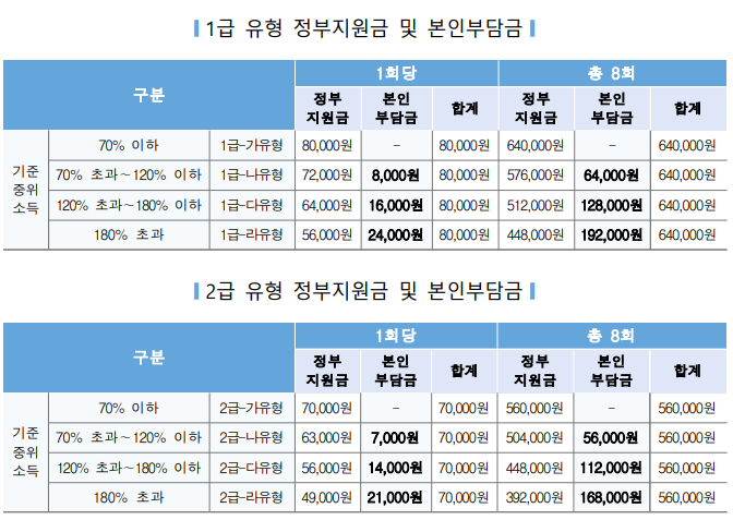 서비스 단가 : 1회당 1급 유형은 8만 원, 2급 유형은 7만 원