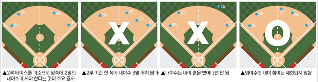 수비팀은 포수·투수 제외 내야에 최소 4명의 야수를 둬야 하며 2루를 기준으로 양쪽에 2명씩 서 있어야 함